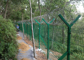 圍墻護(hù)欄網(wǎng)-鐵絲焊接護(hù)網(wǎng)網(wǎng)格結(jié)構(gòu)簡(jiǎn)練、便于運(yùn)輸、安裝不受地形起伏限制,特別是對(duì)于山地、坡地、多彎地帶適應(yīng)性極強(qiáng)。該產(chǎn)品堅(jiān)固耐用、價(jià)格中等偏低,適合大面積采用,產(chǎn)品生產(chǎn)中采用電鍍鋅絲或熱鍍鋅鋼絲焊接成型后浸塑;或是低碳鋼黑絲焊接直接浸塑或先焊接成型后再采用電鍍+浸塑;鍍鋅+噴塑,噴漆 等方式,表面處理方式采用外表面浸塑,該技術(shù)處理方式先進(jìn)且成熟,能全方位吸附包裹產(chǎn)品表面,附著力和防腐性極強(qiáng),且PE&PVC材料具有無毒無害,防腐、防老化、抗曬、耐高、低溫等特點(diǎn)。